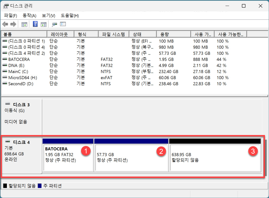 → ② ③ 영역을 exFat으로 포맷한다