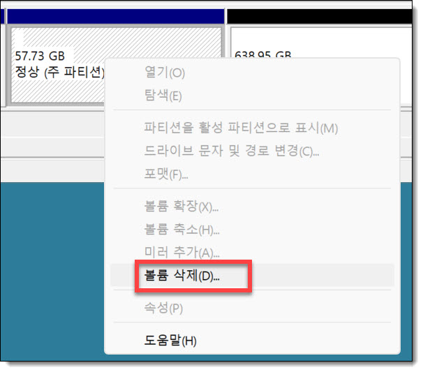 ② 영역에 마우스를 우클릭한 후, "볼륨 삭제"를 선택하고