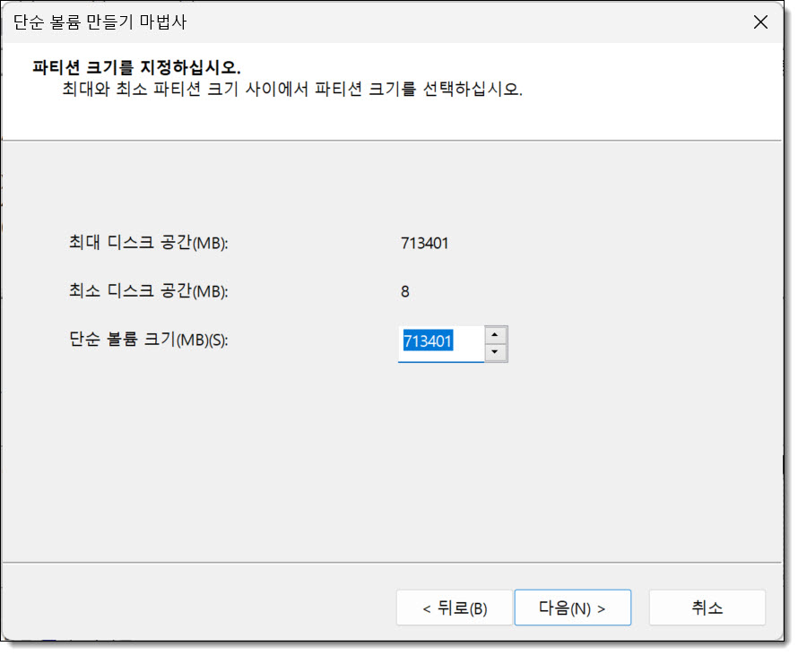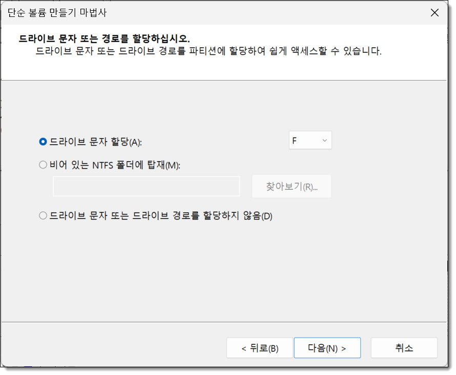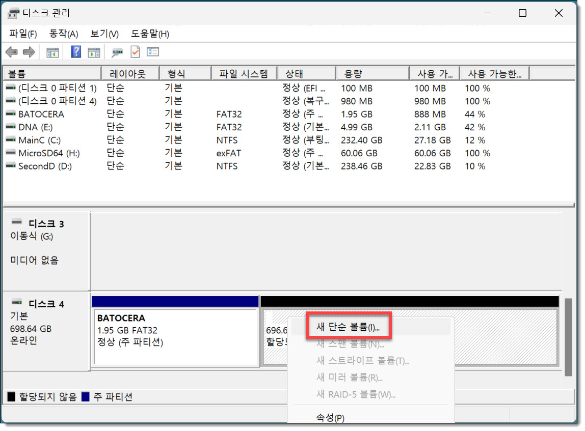 할당되지 않은 공간에 우클릭한 후, <새 단순 볼륨>을 선택합니다.