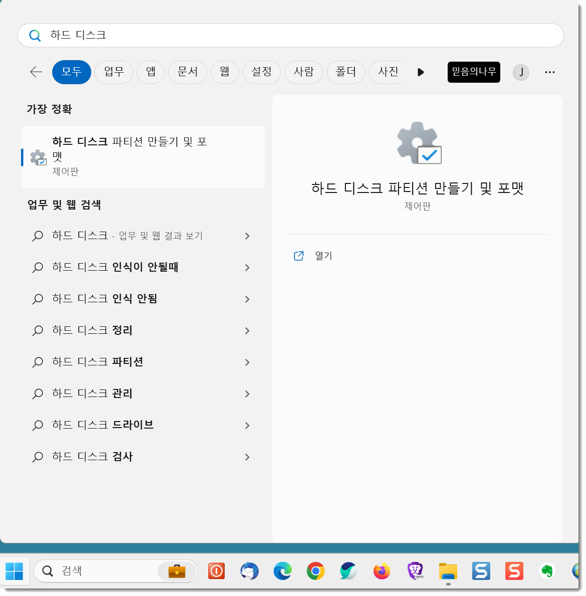 윈도우키를 누른 후 <하드 디스크 파티션 만들기 및 포맷>을 타이핑해 앱을 실행시킵니다.