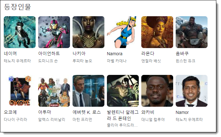 전편에 나왔던 슈리 역의 <레티티아 라이트>, 오코예 역의 <다나이 구리라>, 음바쿠 역의 <윈스턴 듀크>,
